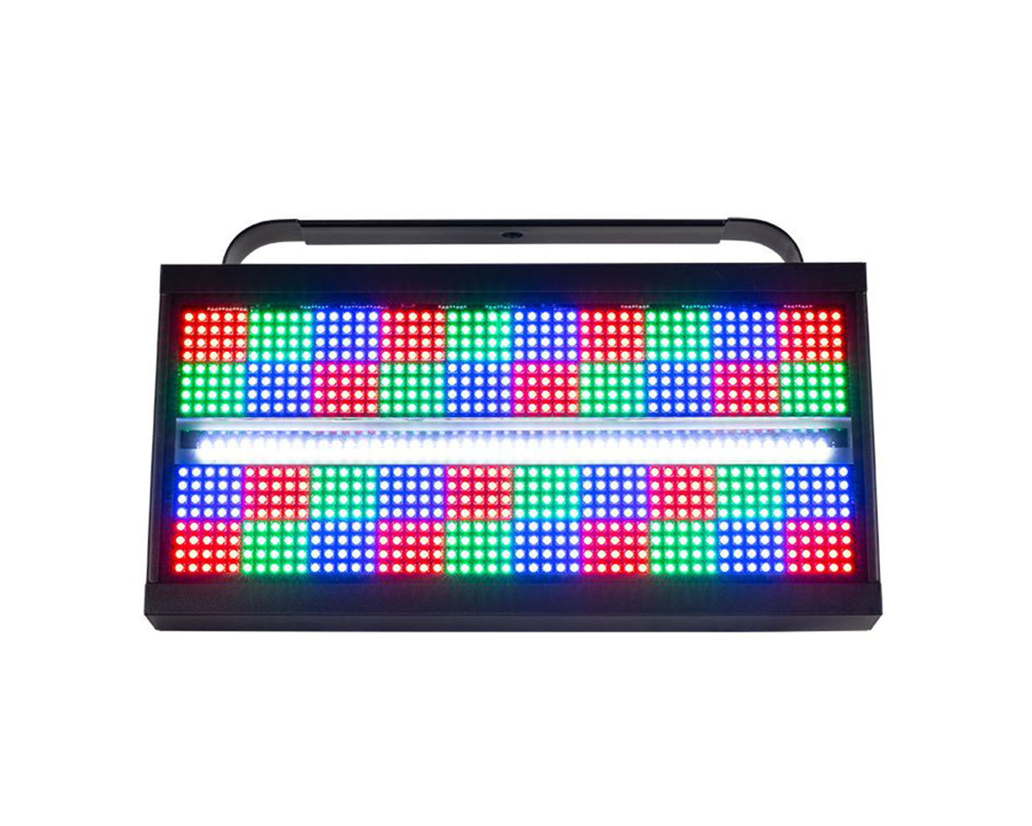 The ADJ Jolt Panel FX is an innovative multi-use strobe / eye candy fixture. It is equipped with 800 RGB SMD LED for color strobing and eye candy effects, and 48 white SMD LED located in the center of fixture to create the traditional look of a strobe. Zone chasing control provides an eye candy effect when used together with the white LEDs. The Jolt Panel FX’s massive light output is specifically designed for large stages, nightclubs, live events and touring.