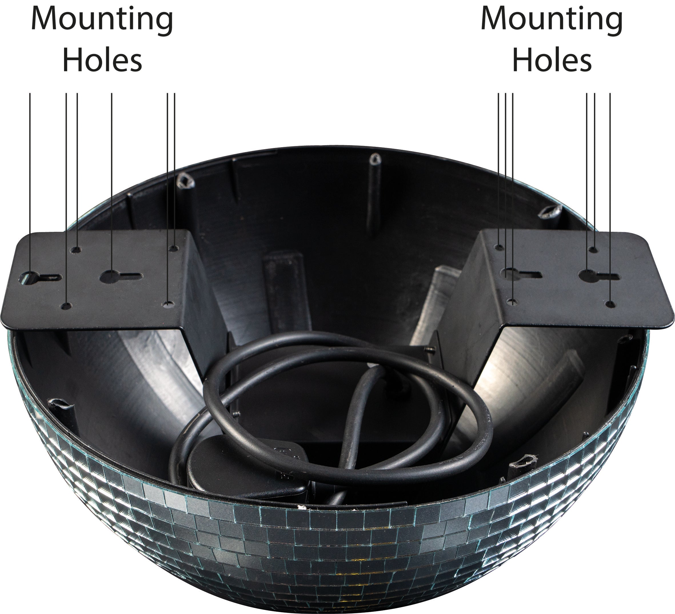 A lightweight half mirror ball which can provide a disco atmosphere to any party or gathering. The mirror ball turns through 360 degrees thanks to the integral rotating motor. A sparkle effect is projected onto surfaces within range when a spotlight is directed onto the mirror balls surface. Half mirror balls are the ideal solution for rooms or venues with lower ceilings where height presents an issue. The half mirror ball has an integral bracket with 2 keys lots on either side allowing it to be permanently and safely fixed to any wall or ceiling. These mirror balls are made from lightweight material and covered with polished mirror glass facets. The mirror ball rotates at 1rpm.