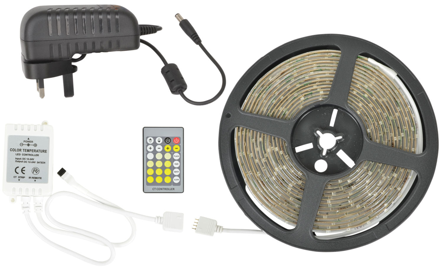 Retail ready colour box packed warm white / cool white LED tape together with UK adaptor power supply, IR controller and connectors to get started. The tape has an adhesive back and an epoxy coating to protect from damage and also makes it IP65 rated. Use the remote to set what sort of colour output you require such as cool white, warm white, or a mixture of both for a more neutral tone. It is low voltage operated at 12Vdc and the self adhesive backing allows for quick and easy installation in kitchens, bathrooms in either the home, caravan, cars or lorries.