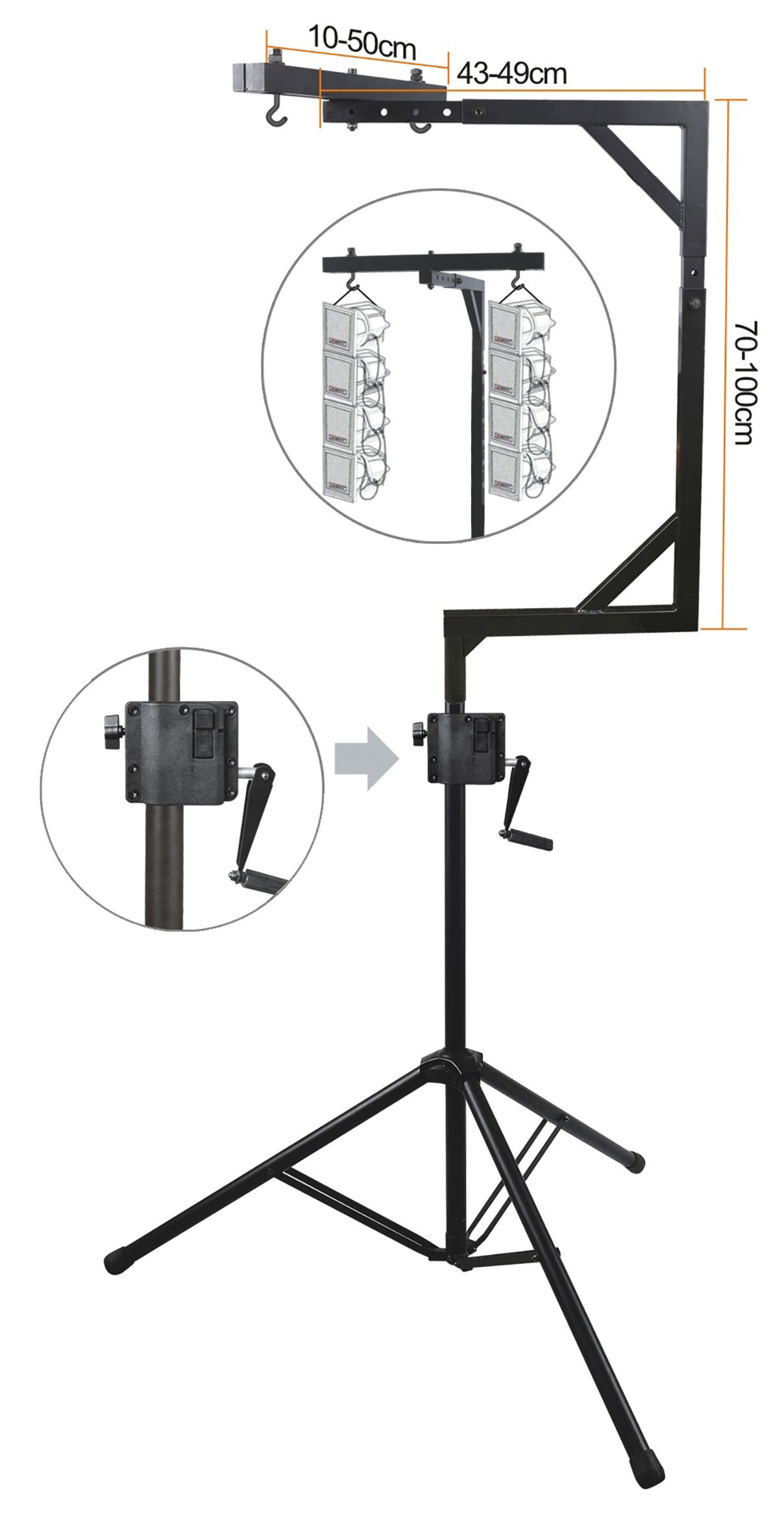 This heavy duty, height adjustable lighting stand/line arraywith swivel arm and winch is perfect for hanging both longer lights and speakers. 2 hooks are supplied to allow you to hang up to 2 lights or speakers. Height adjustable from 1.8m to 3m by using the winch with stability provided by the sturdy tripod base. Lightweight and portable, only 16kg, making it perfect for use in bars, nightclubs and for mobile DJ’s. Both the vertical and horizontal bars can be extended manually allowing you to find the perfect positioning for your lights. The vertical bar can be extended from 70-100cm and the horizontal arm can be extended from 43-49cm. Very generous maximum load capacity of 50kg. Made from high strength steel.