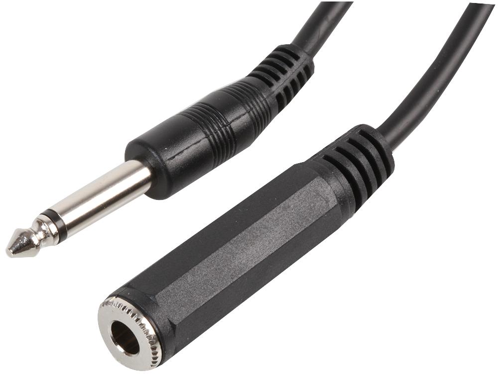 6.35mm (¼”) mono plastic jack plug to 6.35mm (¼”) mono plastic in-line socket. Black straight cable. Pure copper conductors.