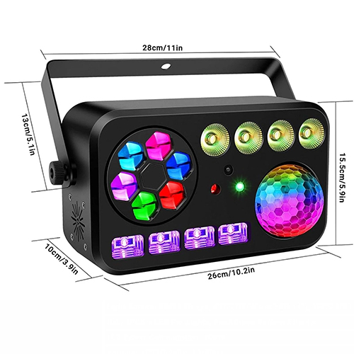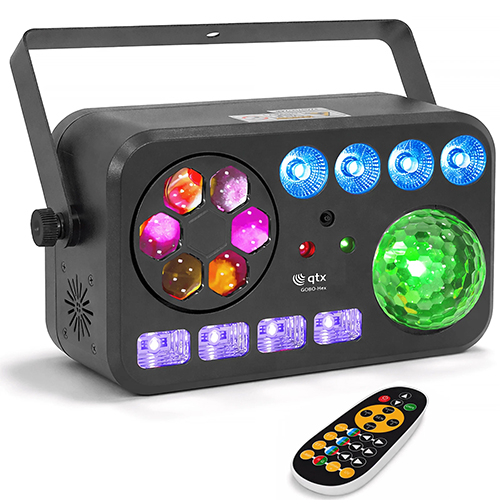 A lightweight 6-in-1 light effect combining a range of colourful GOBOs, 10W RGBW magic ball, 4x White Strobe/UV LEDs, 4x 4W RGBW PARs and Dual colour Laser in one convenient fixture