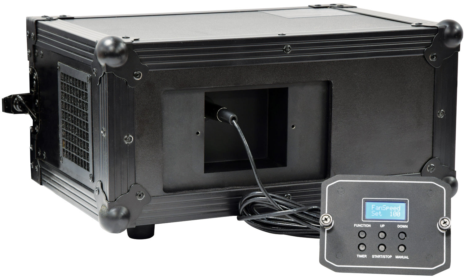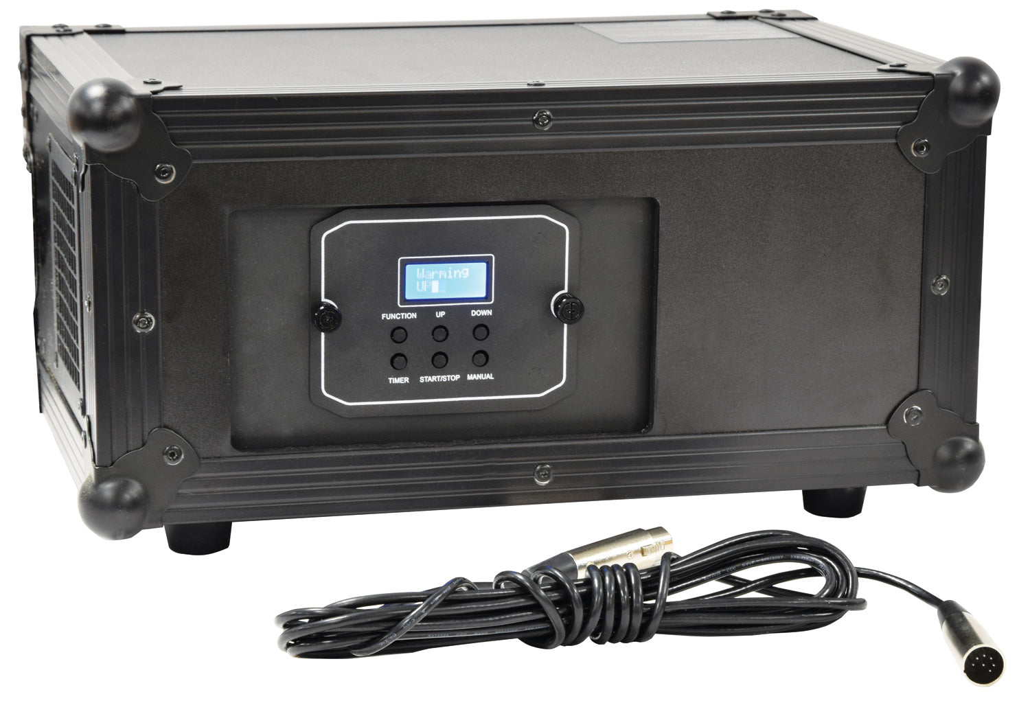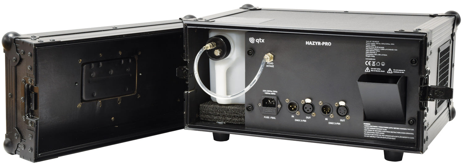 Professional high output haze generator built into a sturdy flight case. Operated via DMX512 signal or in auto-timer mode from the onboard digital control panel. Instant thermal design provides fast response to control signals and a DC fan offers precise control over air-flow. Designed to produce high volumes of haze output on demand with precision control.