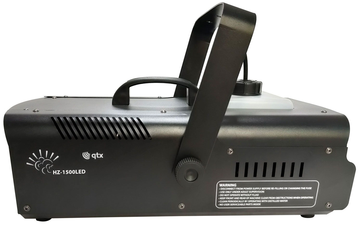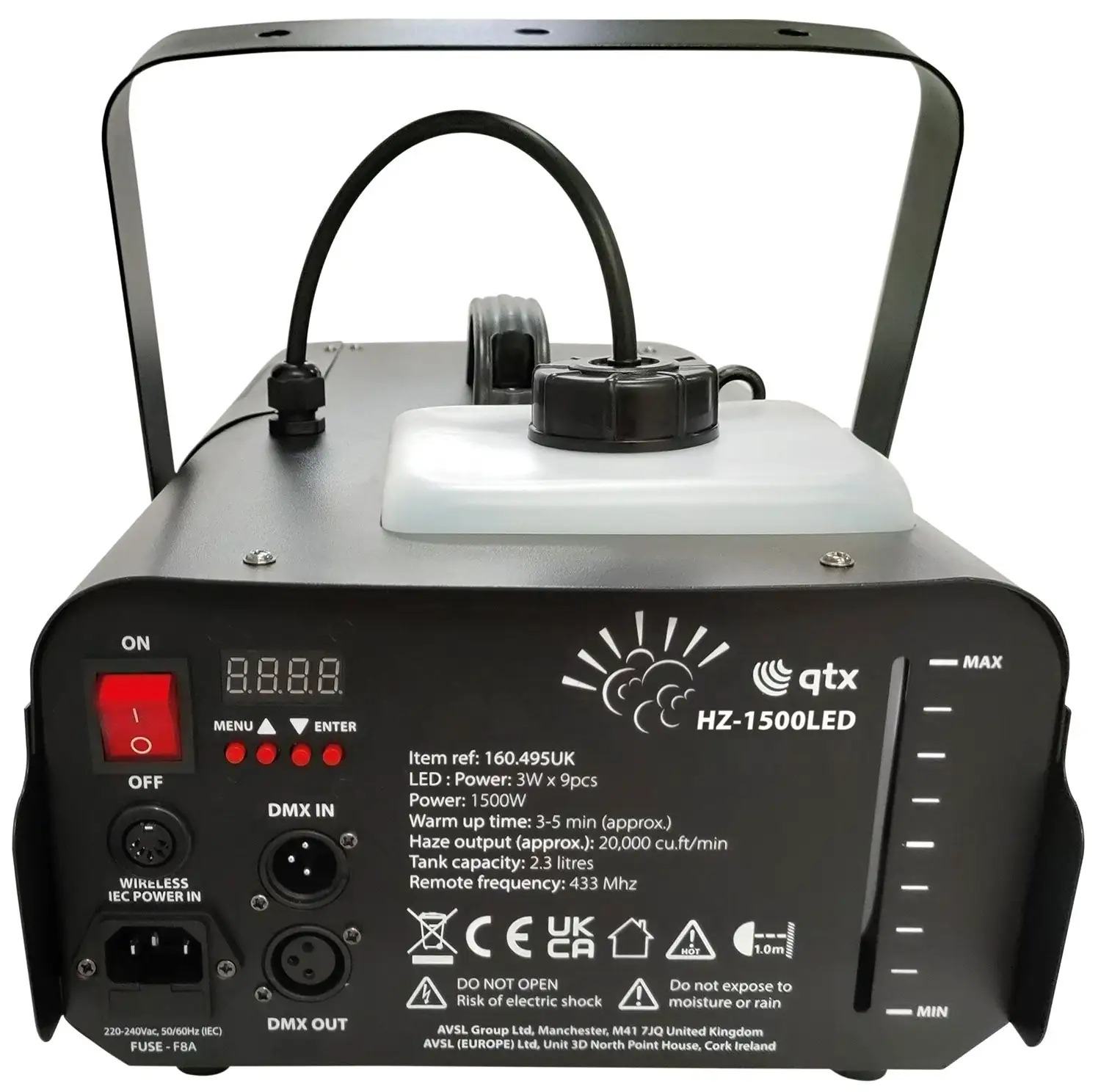 A high efficiency 1500W fog machine capable of producing 20,000 cu.ft per minute of smoke to rapidly fill larger venues. The smoke effect can then be highlighted with an array of colours from the 9 bright LEDs housed in the front of the unit. The smoke and light effects are easily controlled using either the included keyfob-style RF wireless remote or by 6-channel DMX connection. The 2.3 litre fluid bottle can be removed for easy refilling and there is a slot window to indicate the current fluid level.