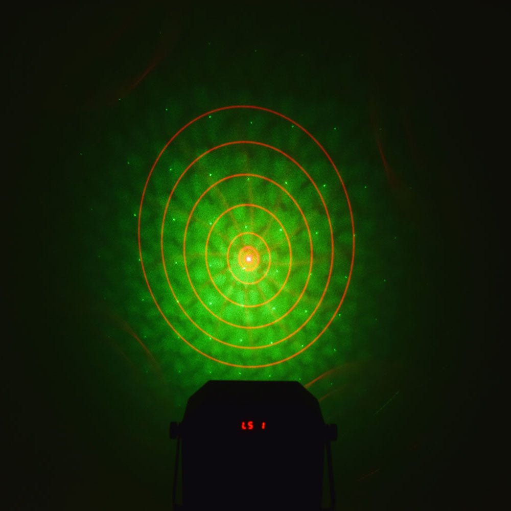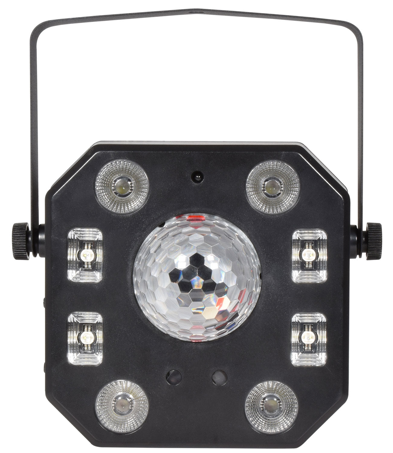 A compact and lightweight 5-in-1 light effect, combining a 12W RGBW Effect ball, 4x White Strobe/UV LEDs, 4x 6W RGBW PARs and Dual colour Laser in one convenient fixture. Easy to setup and use via an array of integrated automatic programs or sound to light. More precise control is provided via either 18-channel DMX connection or the included IR remote control.
