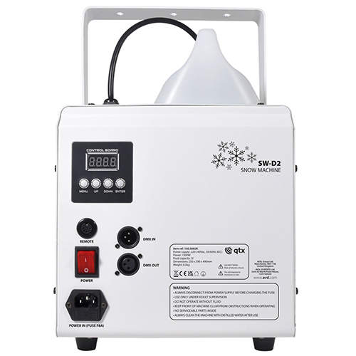 High output digital snow machine for large venues and seasonal events. Utilises a heavy duty fan to convert snow fluid into a blizzard of foam particles, giving the impression of snowfall. Control using the digital panel on the rear of the unit, by the included wireless remote or single channel DMX if required. Purpose built for professional stage shows, themed installations and corporate events.