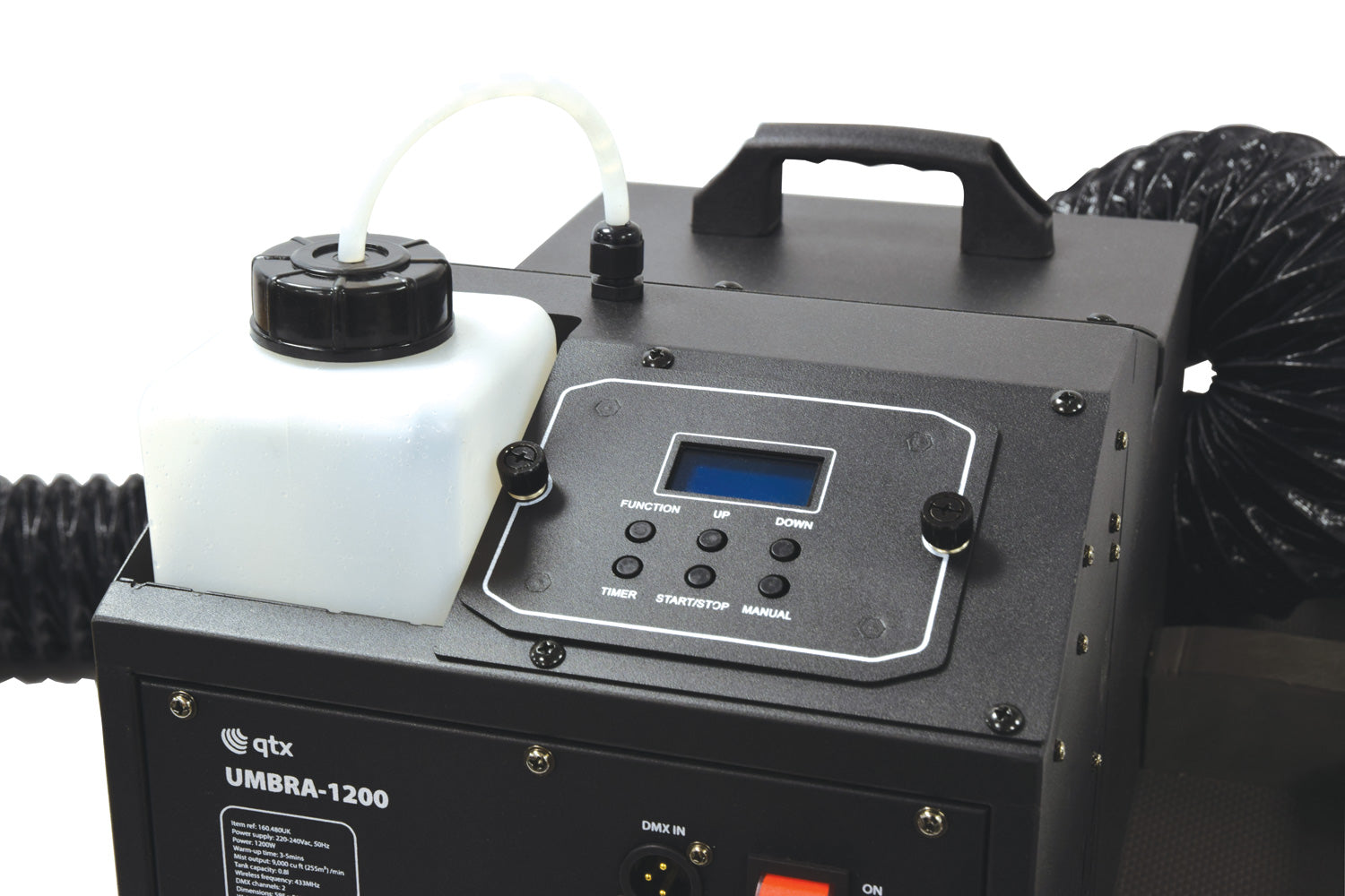 Stage effect machine producing “dry ice” type low fog effects without the use of carbon dioxide or ice. New technology delivers a ground-hugging mist from standard fog fluid and water. Housed in a full flight case with castors for portability, the main unit has a removable fluid tank and easy access water reservoir with drain tap. the mist is delivered via a flexible duct and output funnel to allow the user to direct the effect onto a specific area of the stage. Operated by the onboard digital control panel, which can be detached as a wired remote or via DMX512. Designed to provide a dramatic low flowing mist scene for stages, theatres and themed events.