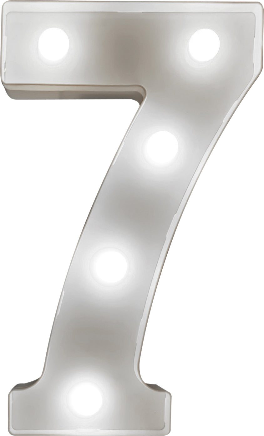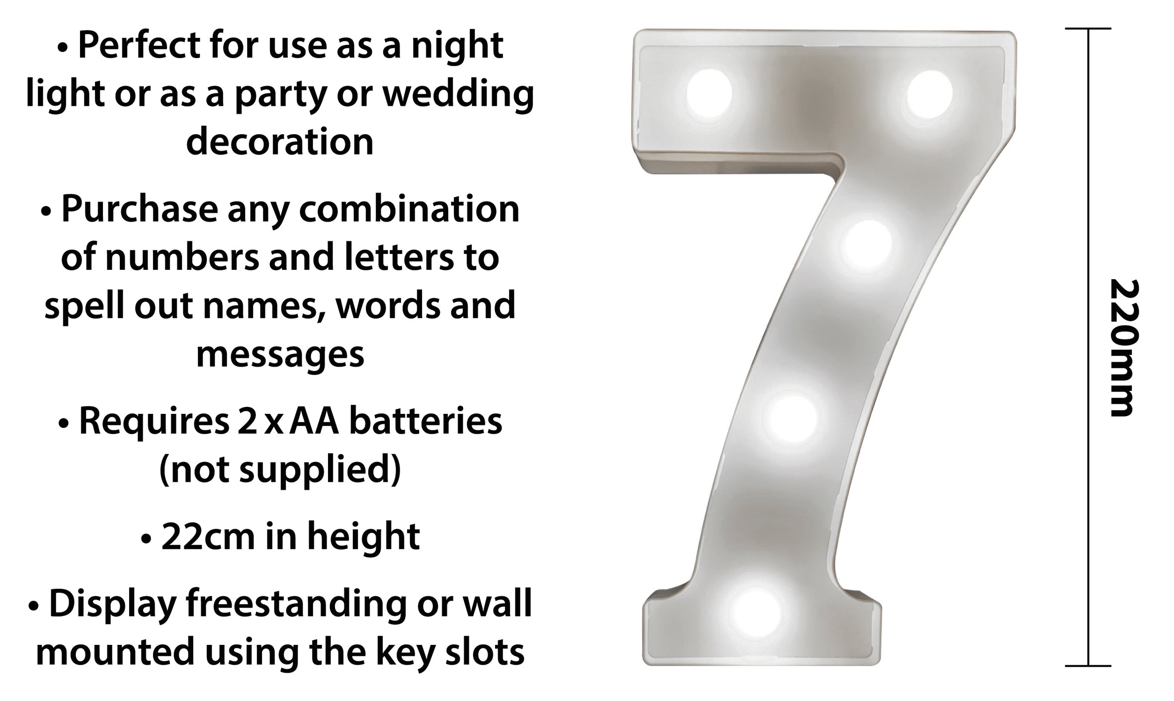 These battery operated 3D LED number lights are perfect for use as night lights or as party and wedding decorations. By purchasing a combination of numbers and letters you can spell out names, words and messages. The lights require 2x AA batteries (not supplied) and have an on/off switch. Each light can be displayed free standing or use the key slots in the back of the light to wall mount. When switched on the LED lights on the numbers create a warm and pleasing glow.